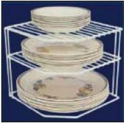 Heavy duty rack has 2 shelves and space below bottom shelf for convenient storage in your RV or boat.(Holds up to twelve dinner plates.) Space saving unit fits into most corners. washable cushion-coated steal construction. 9"L x 9" W x 11" H. White.
